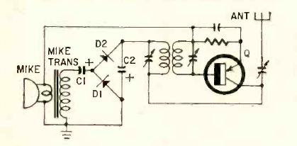 This interesting idea for those who live in noisy places is to power a radio through the sound captured by a microphone. The circuit appeared in Radio Electronics magazine in April 1963 in the Patents section.