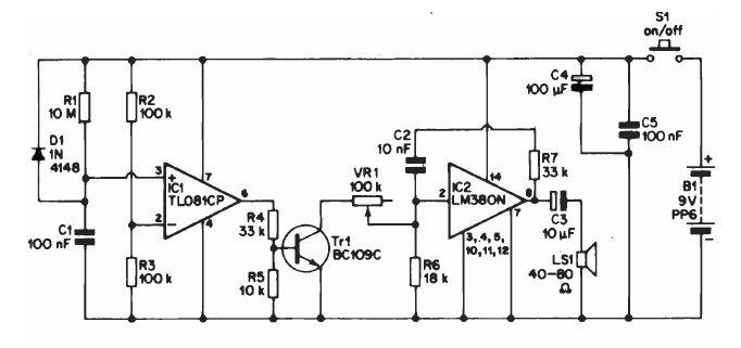 This LM380-based circuit was found in documentation from the 1980s. The components are current, and the transistor may be a general-purpose equivalent. Note the use of a medium impedance speaker.