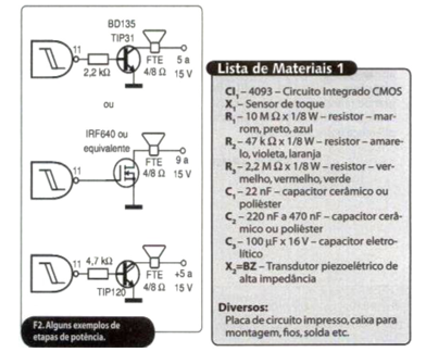 The circuit shown in figure 1 generates an intermittent tone in a piezoelectric transducer when the touch sensor is activated. The frequency of the tone is basically given by R2, which can have values between 10 k and 100 k ohms. It will be interesting to determine the value that produces the highest volume sound in the transducer, as many of them have their maximum performance at a resonance frequency around 4 kHz. The flashing depends on R3 and C2, which can also be changed over a good range of values. The ceramic transducer provides good audio power for applications powered by batteries or 9V batteries, as it has low consumption. However, for applications where greater power is required, or where the reader wishes to use a speaker, the power steps in figure 2 can be used. For power supply above 9 V, the transistor must be equipped with a heat radiator. The touch sensor consists of two separate metal plates, which must be touched simultaneously.
