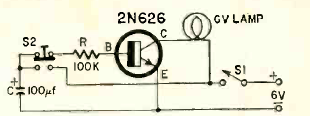 This circuit uses the 2N626, the first commercial Darlington transistor. The transistor activates the lamp at an interval that depends on R and capacitor C, lasting up to a few minutes. We found it in Radio Electronics magazine from June 1961.