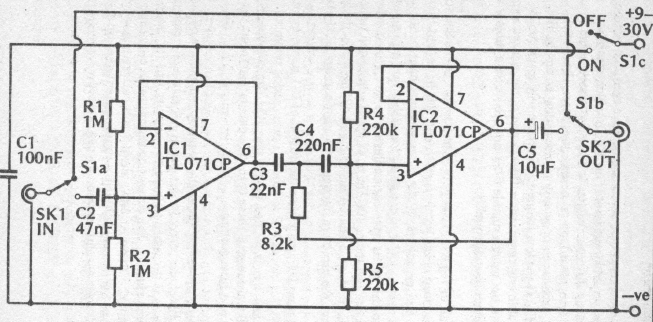 This circuit filters low frequency noise from the turntable motor. We found it in a 1989 documentation. The font doesn't have to be symmetrical, but it should have excellent filtering.