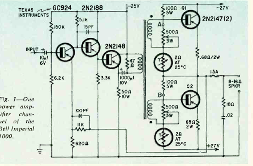 This is a 1960s amplifier setup found in a period publication. The circuit uses a special driver transformer that inverts the phases of the signal to excite the output transistors.