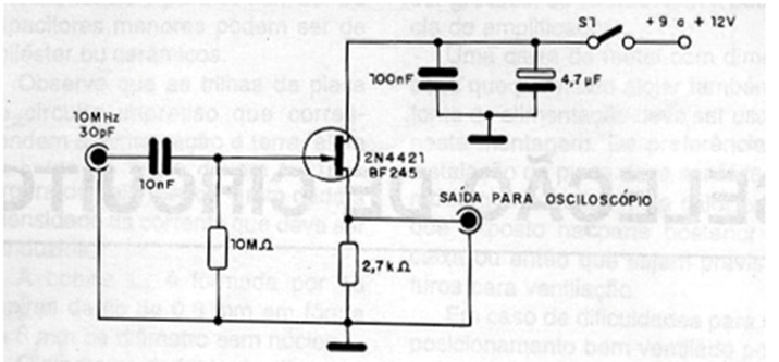 Many oscilloscopes have high impedance inputs that make it difficult to observe high frequency signals in certain cases. With the indicated circuit we can observe signals of frequencies up to 10 MHz, without the problem of impedance matching that can affect the circuit. The junction FET supports equivalents, and as the device's consumption is low, a common 9 V battery can be used to power it.
