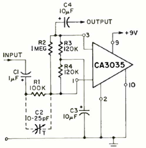 This circuit was found in the February 1970 issue of Radio Electronics magazine. It uses an RCA operational amplifier released at the time. The gain is 10x and the circuit is suitable for low frequency signals.