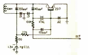 This oscillator uses germanium transistors. It was found in the Radio Electronics magazine of may 1953. The crystal determines the frequency, being a maximum of 1 MHz.