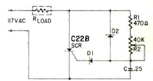 This circuit was developed by General Electric and was published in Radio Electronics magazine in June 1964. The SCR must be mounted on a heat sink. It is suitable for model making applications also with 12 or 24 V AC power supply.