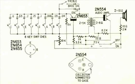 This two-transistor circuit was found in Radio Electronics magazine from February 1959. It is powered by a battery and the sound is output to a small speaker.