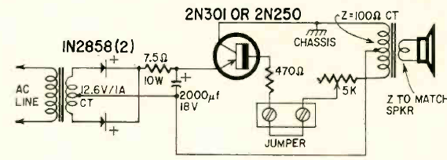 This circuit is nothing more than a powerful audio oscillator or buzzer with a power transistor. The circuit is powered by 12 V and the transistor is the power type of the time. We found it in Radio Electronics magazine from April 1964.