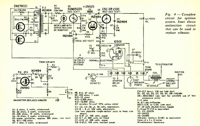 This is perhaps one of the first capacitive discharge ignition circuits published in a magazine. It appeared on Radio Electroncs in July 1962. The components are from the time and the circuit is very well designed.