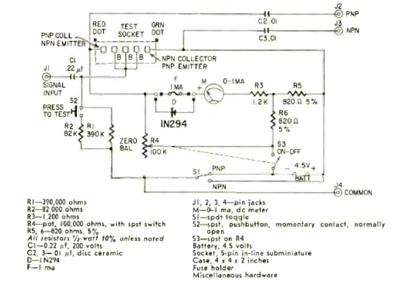 Found in Radio Electronics from May 1959, this transistor tester is quite sophisticated. The circuit uses a 1 mA analog indicator.