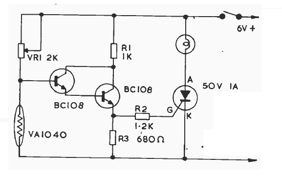 This circuit sensor is an NTC with a resistance of the order of 2k. The SCR can be from the TIC series and the transistors can be BC548.