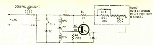 This dimmer with a unijunction transistor and SCR appeared in Radio Electronics magazine in March 1962. Four-layer diodes and unijunction transistors were appearing on the market at this time.