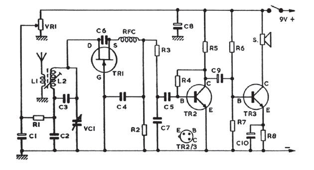 We found this receiver in an old English documentation. The JFET is commonly used and the bipolars can be the BC548s. No information was given about the coils.