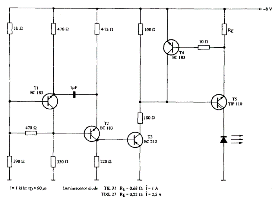 The circuit shown is from a Texas Instruments opto-electronics manual. RE depends on the peak voltage supported by the LED. Observe the polarity of the power supply. Low power transistors can be BC548 for NPN and BC558 for PNP.