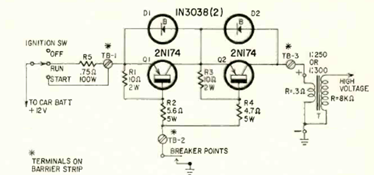 This circuit is from a Radio Electronics from April 1964. The circuit uses power transistors of the time, which must be mounted on a good heat radiator. Modern equivalents can be used.