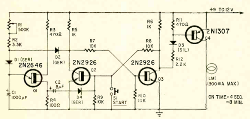 Using the 2N2646 this circuit was found in a Radio Electronics magazine from July 1968. The transistors are from the time and the lamp can be replaced by a high-power LED in a current version.