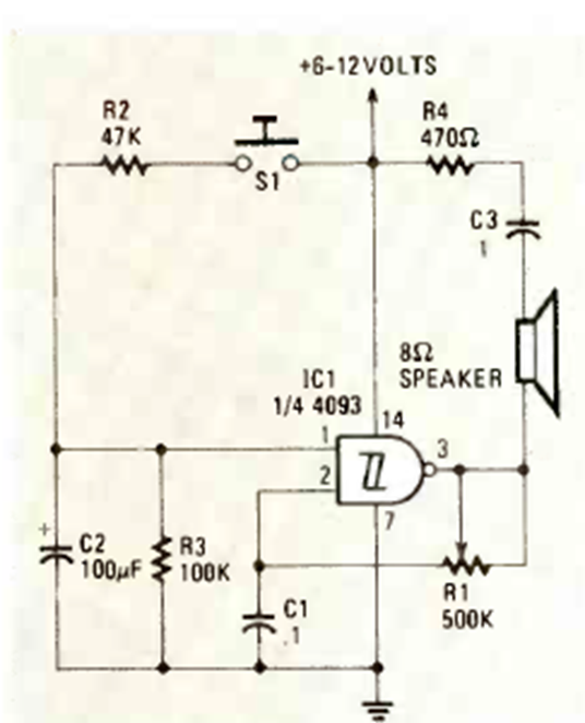 This simple rising and falling siren was found in the October 1985 issue of Radio Electronics magazine. The circuit has no amplifier stage for the speaker. Adding one can greatly improve performance.