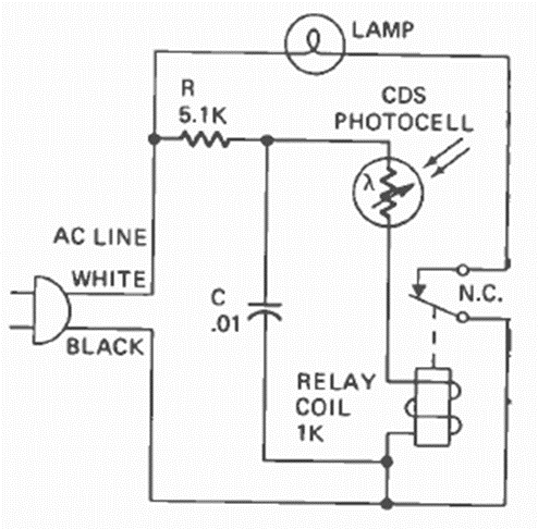 This circuit activates a relay that has a lamp as a load. The circuit is from a Radio Electronics from November 1975. The Sensor is a common LDR. The relay is of the high voltage sensitive type.