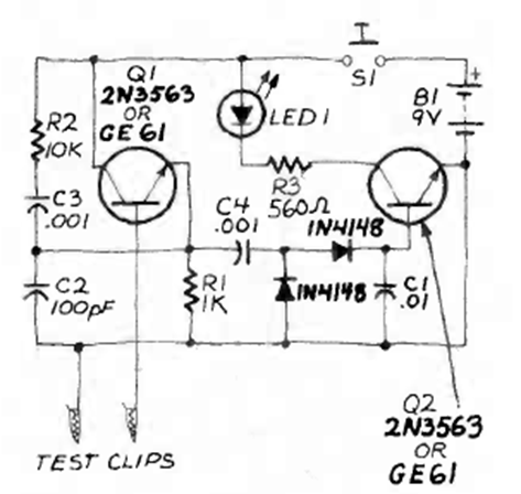 This simple test circuit was found in the April 1983 issue of Radio Electronics magazine. The transistor is a general-purpose transistor and is powered by a 9 V battery.