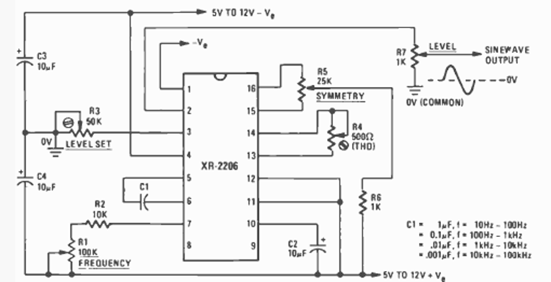 The figure shows how to use the XR2206 to generate sinusoidal signals in a different way. The circuit is from Radio Electronics from April 1977. The power supply is indicated.