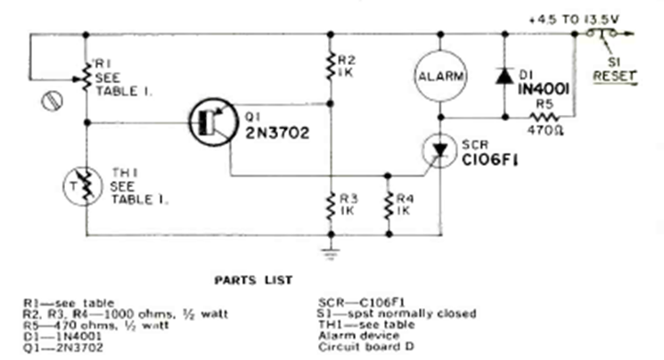 We found this circuit in the September 1971 Radio Electronics magazine. The SCR can be any of the 106 series and the buzzer can be replaced by a relay according to the supply voltage.