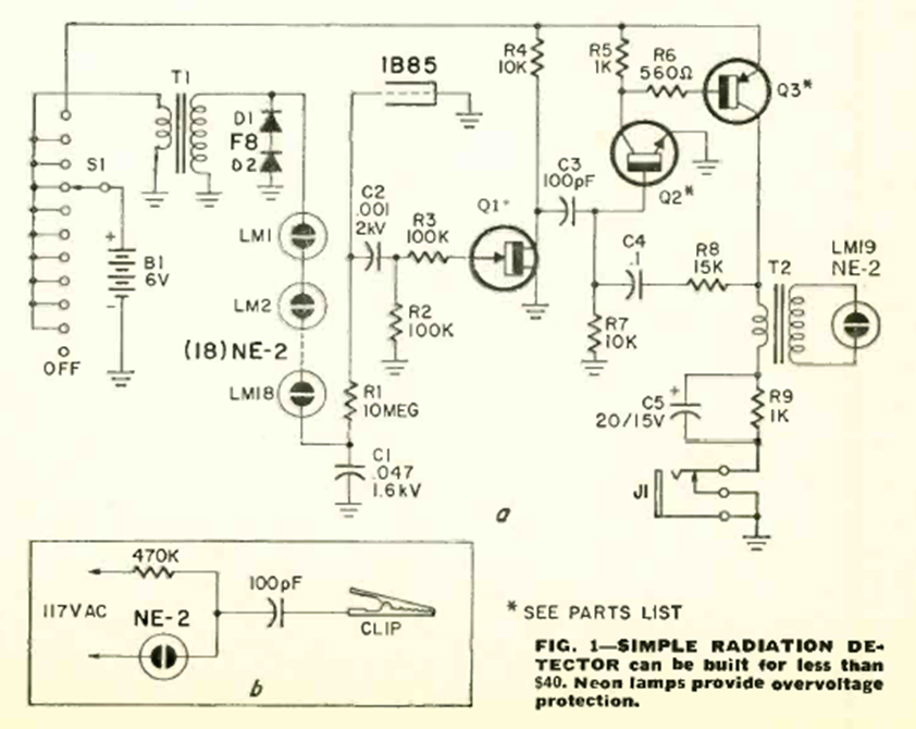 This circuit was published in a January 1971 issue of Radio Electronics to check television emissions. The circuit uses a Geiger IB85 tube of the time whose address for purchase was given by the magazine.