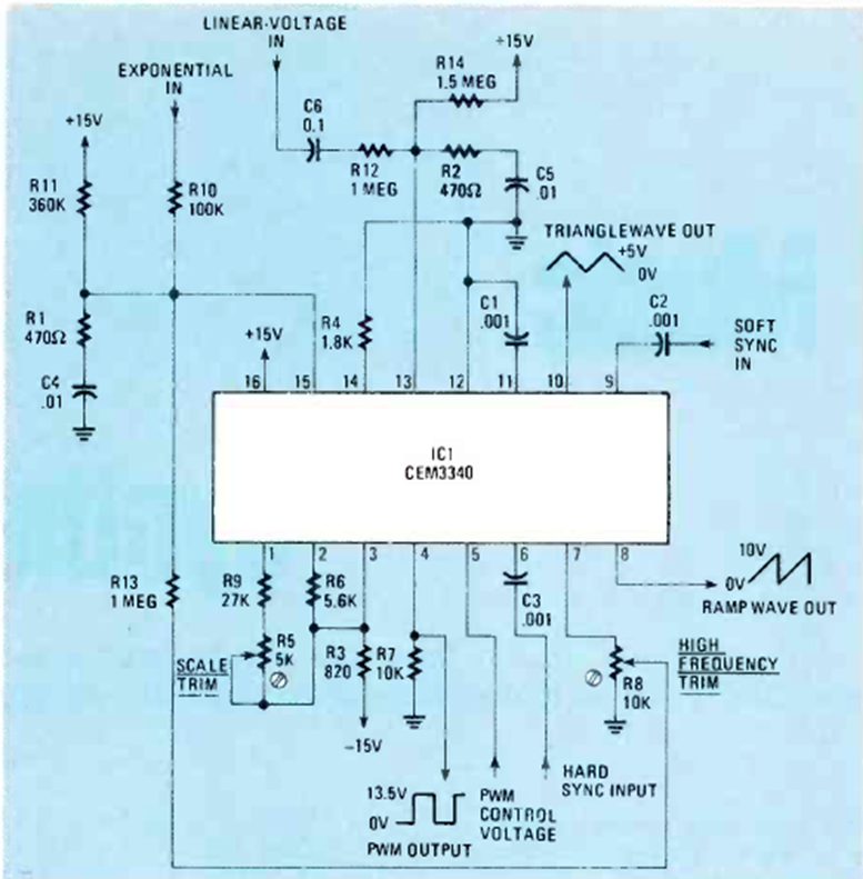 This circuit appeared in the May 1983 issue of Radio Electronics magazine. It is based on the dedicated integrated circuit CEM3340. The circuit provides signals with various waveforms.
