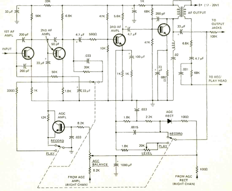 We found this circuit for old tape recorders in the December 1972 Radio Electronics magazine. The circuit uses 4 transistors and must be powered with the indicated voltages. The power supply is not provided.