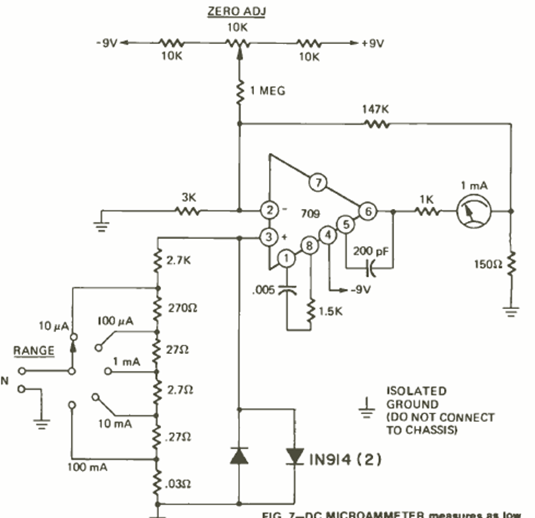 Using a 709 integrated circuit this circuit was found in the June 1972 issue of Radio Electronics magazine. More modern operational equivalents can be used. The power supply is symmetrical.