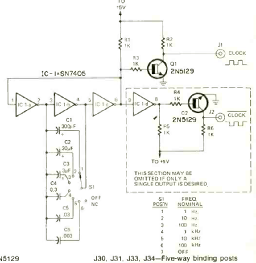 We found this circuit in the Radio Electronics magazine of December 1972. It generates signals in 6 frequency bands, being indicated for experimental applications with TTL circuits.