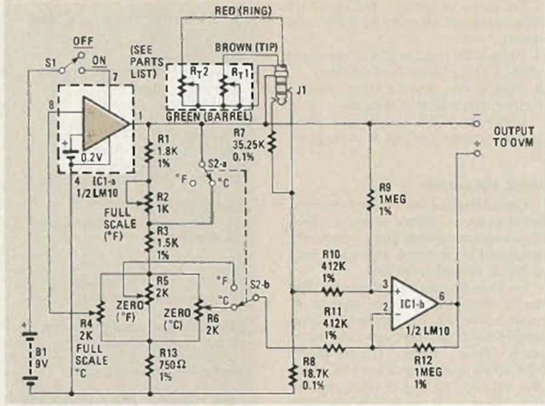 The temperature range of this circuit is different from the previous one, while maintaining the same configuration. The circuit is from a Radio Electronics from June 1985.