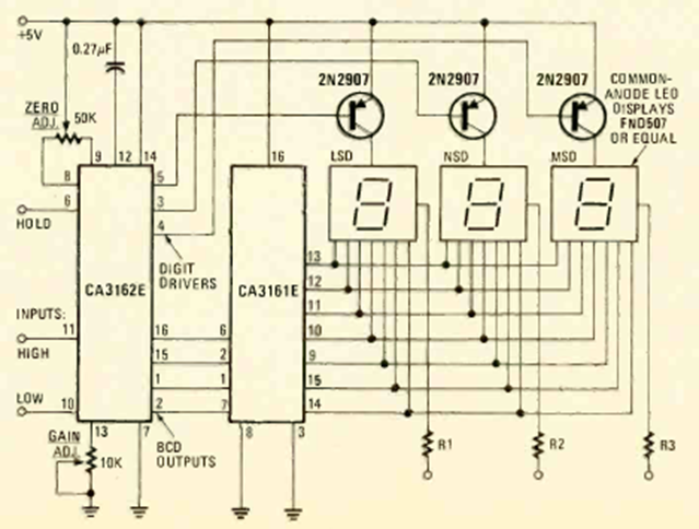 The CA3162E and CA3161E pair were widely used to create a 3-digit digital display. This basic circuit was found in the December 1979 issue of Radio Electronics magazine.