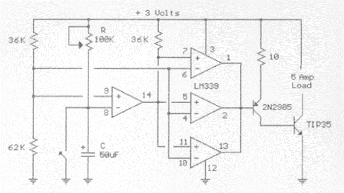 This circuit with a voltage comparator is delayed by the capacitor. The circuit drives a power transistor that must be equipped with a good heat sink.