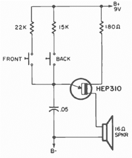 This unijunction buzzer configuration appears in this section from many publications and sources. The circuit has frequencies given by resistors. We found it in the April 1971 Radio Electronics magazine.