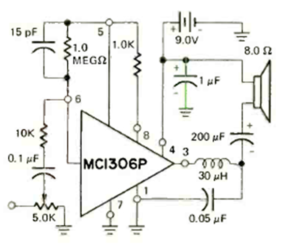 This low-power audio amplifier was found in the April 1973 issue of Radio Electronics magazine. The integrated circuit is from that time, and it is battery powered.