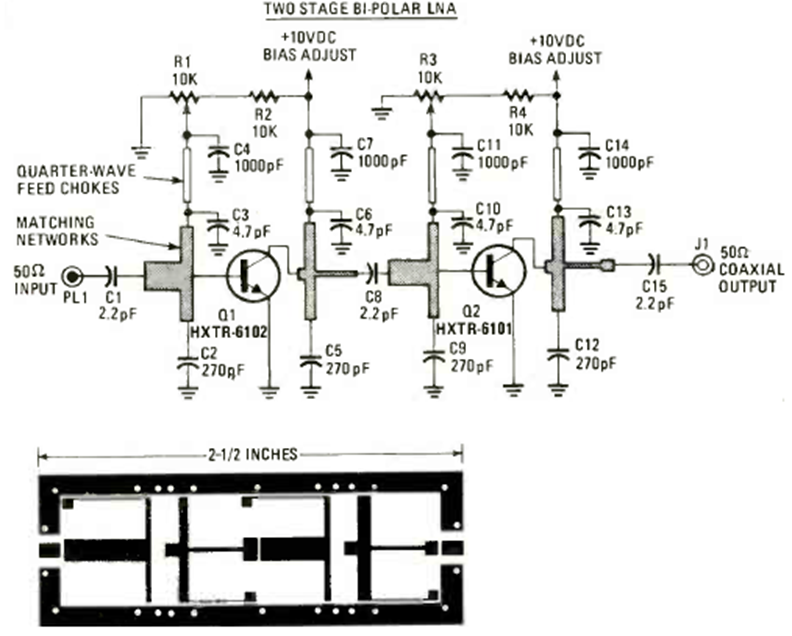 Used in satellite TV receptions in the 1980s, this circuit was found in the March 1980 issue of Radio Electronics magazine. Note the board layout.