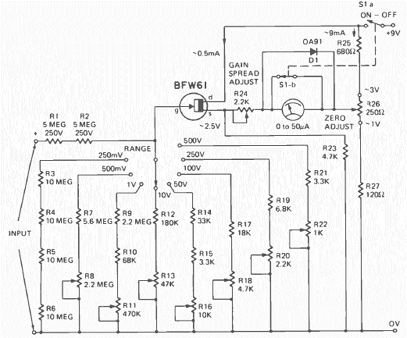 This nice analog indicator circuit was found in the January 1974 issue of Radio Electronics magazine. The circuit has 8 scales with individual adjustments. The instrument is rated at 50 uA.