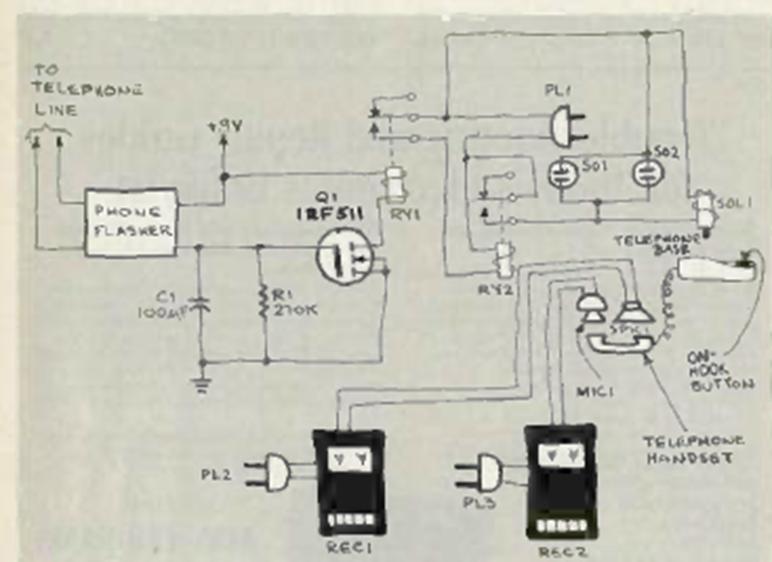 This type of answering machine was common at the time this circuit was published. Using two tape recorders, it was published in the June 1986 issue of Radio Electronics magazine.