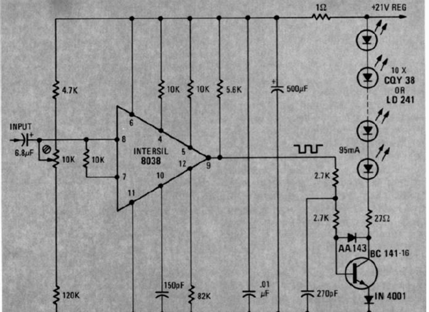 This circuit is from Radio Electronics from March 1977. The integrated circuit is from that time and the circuit is intended for an infrared audio link. The modulation is in pulse frequency.