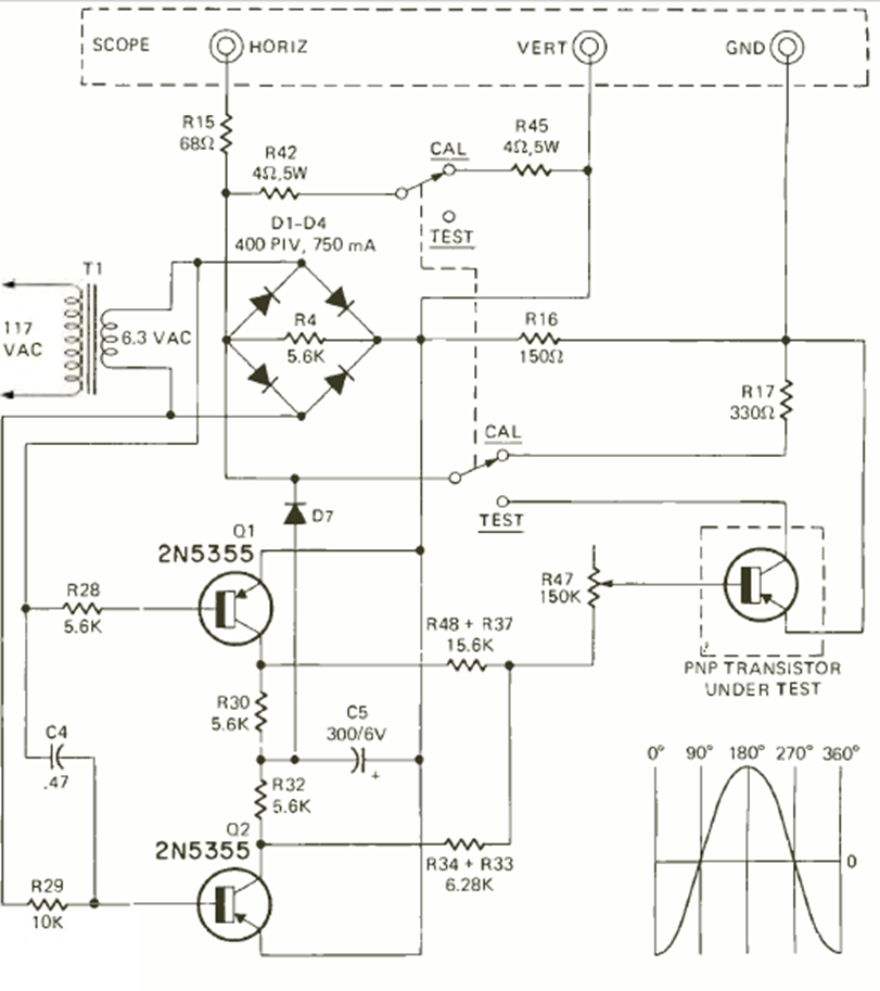 This interesting circuit for testing signal transistors with the oscilloscope was found in the November 1972 Radio Electronics magazine. The transistors used can be replaced by equivalent ones and the transformer is 200 to 500 mA secondary.