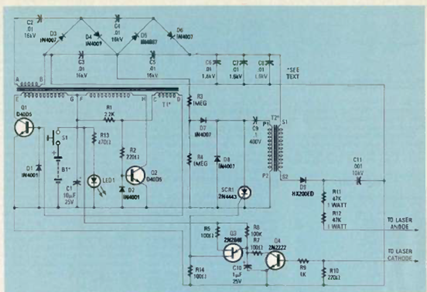 This few kilovolt gas laser power supply was found in the June 1986 issue of Radio Electronics magazine. No transformer data was provided.