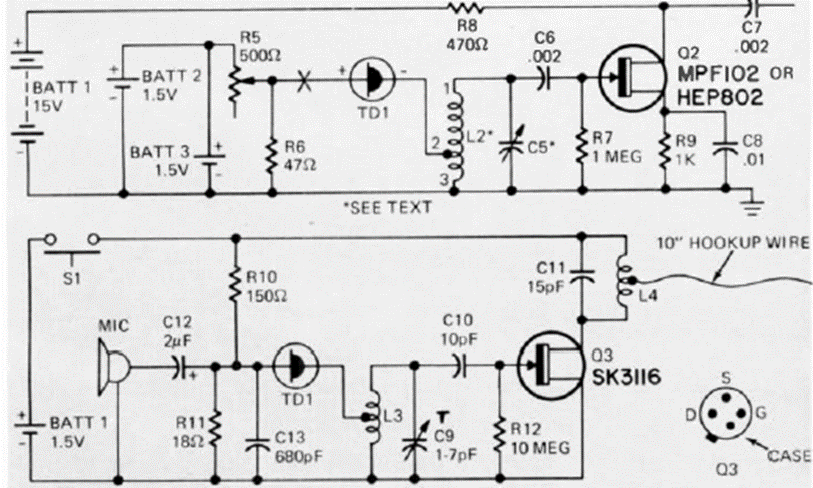 We found this circuit in a Radio Electronics issue from August 1974. The frequencies generated depend on the LC circuits and it also has a modulation stage, operating as a small experimental transmitter.