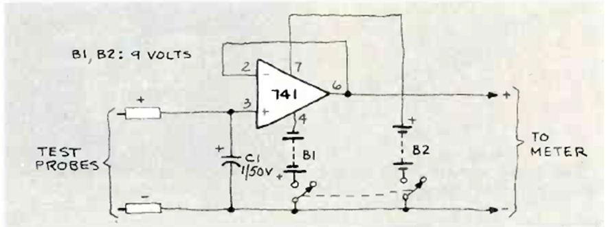 The purpose of this circuit is only to increase the input resistance of a multimeter, since there is no voltage gain. The batteries are 9 V and operational equivalents can be used.