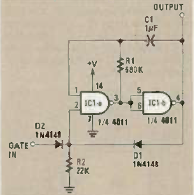 This circuit has a normally low output that is triggered by a high pulse. The circuit is from Radio Electronics from November 1984. The frequency is given by C1.