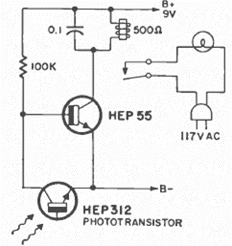 This circuit was found in the April 1971 Radio Electronics magazine. The 100k resistor can be replaced by a 10k resistor in series with a 1M trimpot to obtain a sensitivity adjustment.