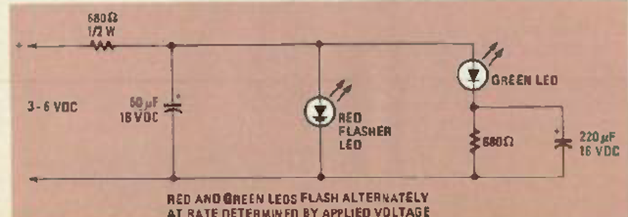 This alternating flashing system uses two-color LEDs. The circuit is from a Radio Electronics magazine from October 1980. Component modifications may be necessary depending on the characteristics of the LEDs.