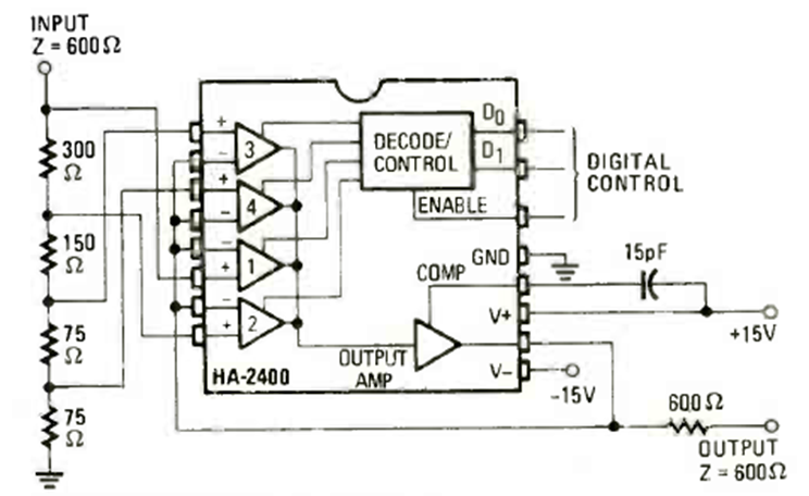 This circuit uses an HA2400 consisting of 4 digitally controlled operational amplifiers. The circuit is from a Radio Electronics magazine from March 1980. The power supply must be symmetrical.