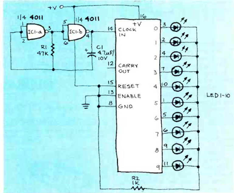 This counter was found in the November 19983 issue of Radio Electronics magazine. The power supply can be between 3 and 12 V typically. The counting speed depends on C1.