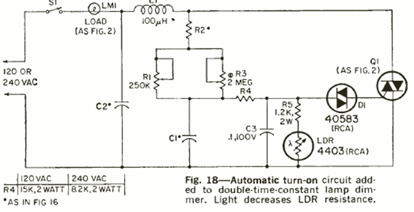 This circuit was obtained from the July 1970 issue of Radio Electronics magazine. The circuit turns on an incandescent lamp when the light on the sensor is dimmed or cut off. The triac is matched to the lamp.