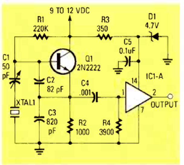 We found this circuit in the Radio Electronics magazine of January 1986. The frequency is given by the crystal and any TTL port will do, and it must be powered with 5 V.
